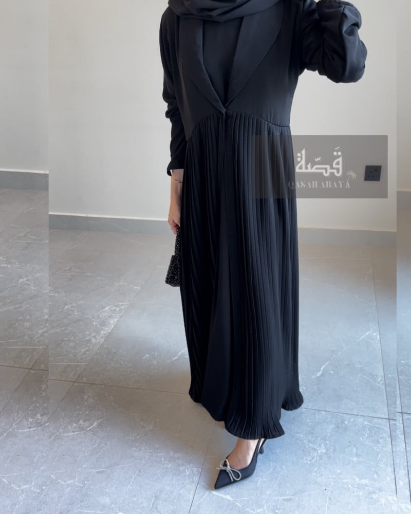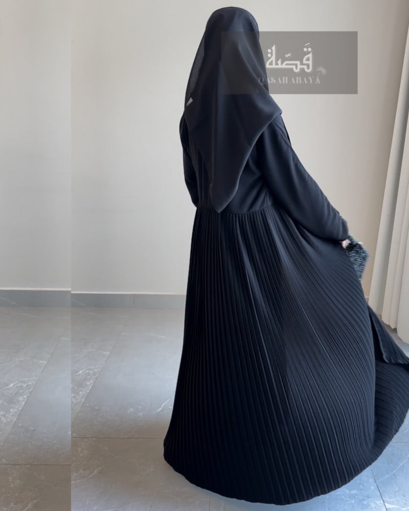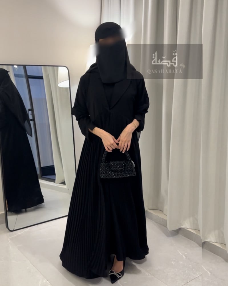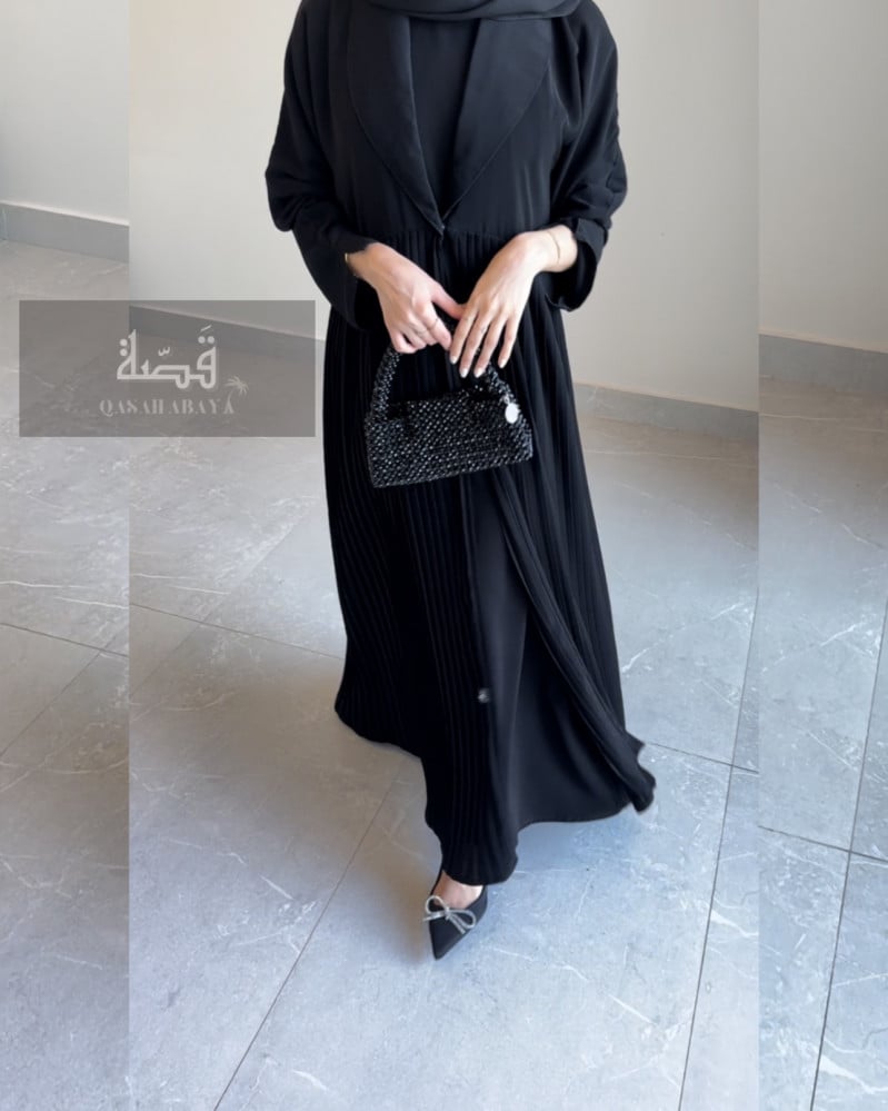 عباية رسمية مع ياقة قصة A (كلوش) مع كسرات وسط العباية وفتحة صغيرة بالكم