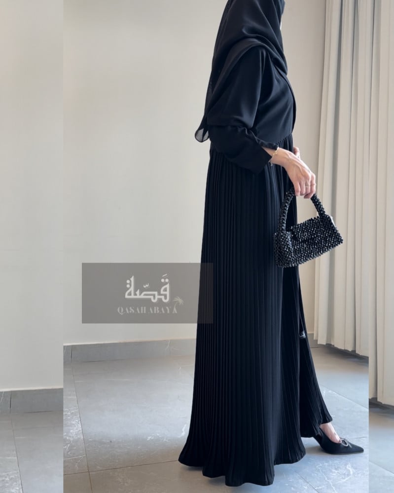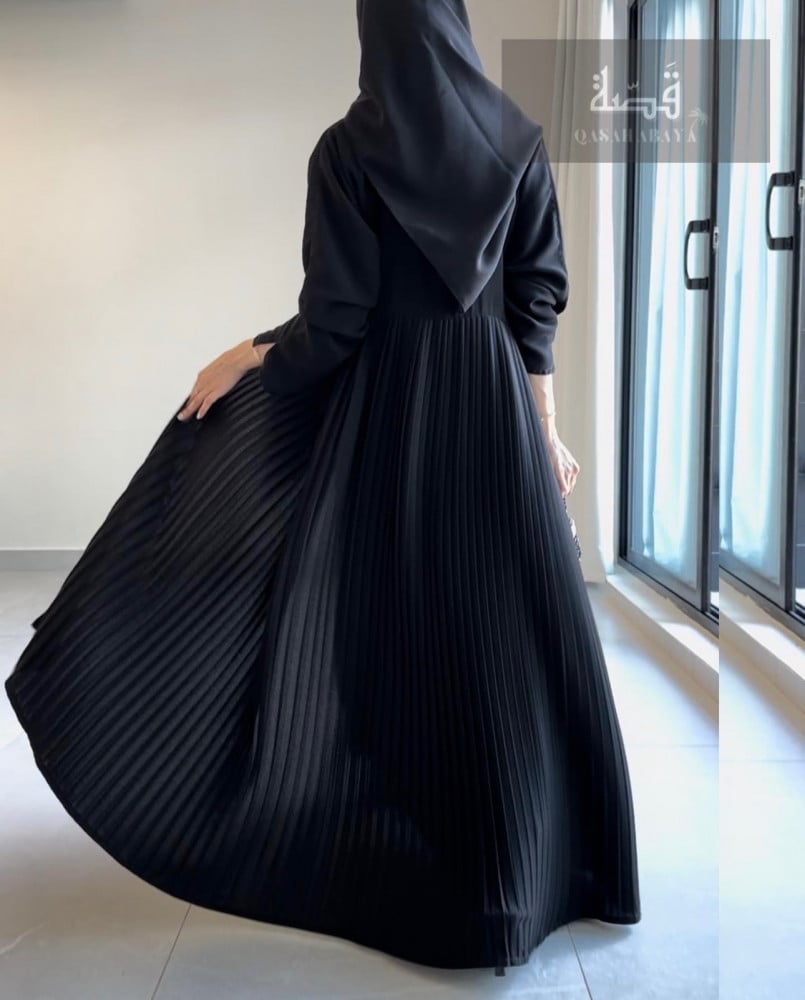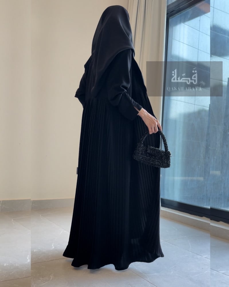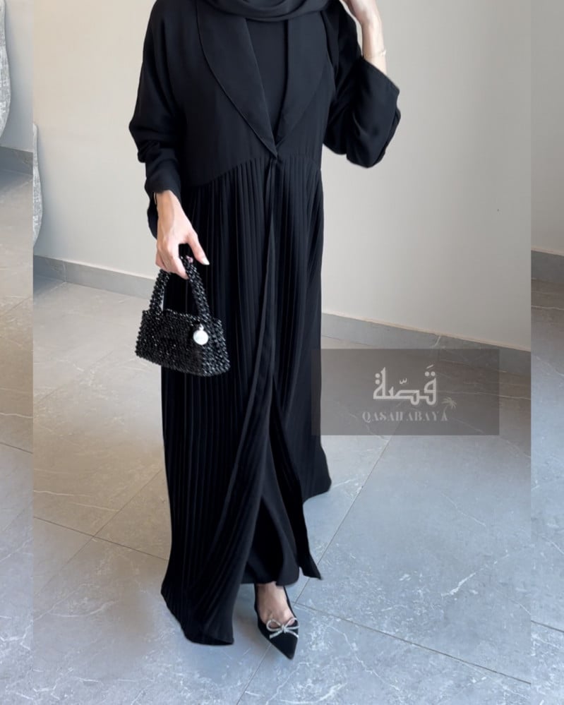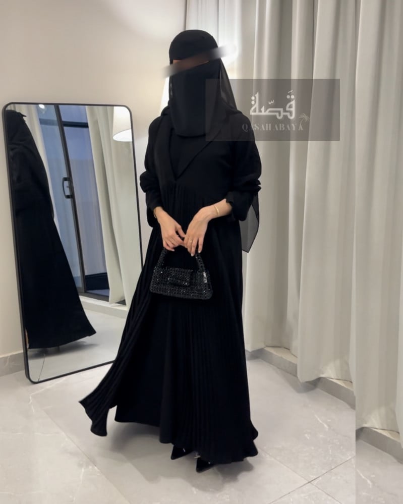 عباية رسمية مع ياقة قصة A (كلوش) مع كسرات وسط العباية وفتحة صغيرة بالكم