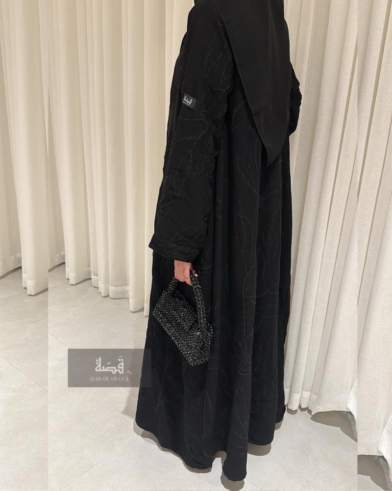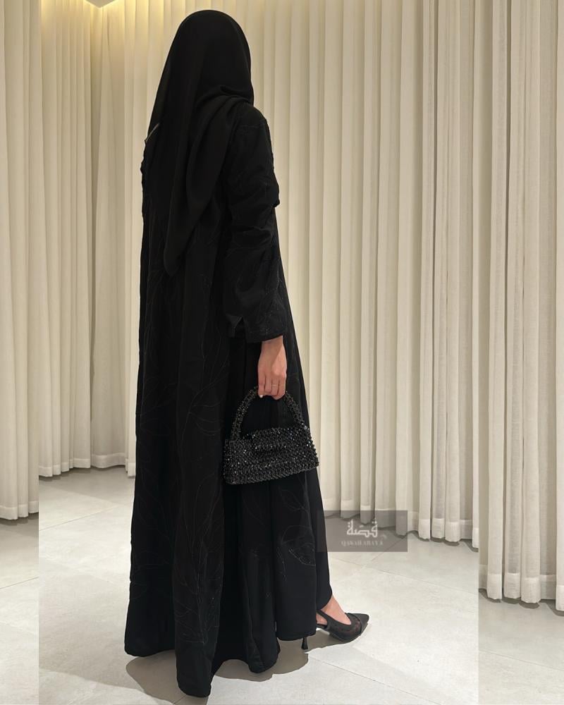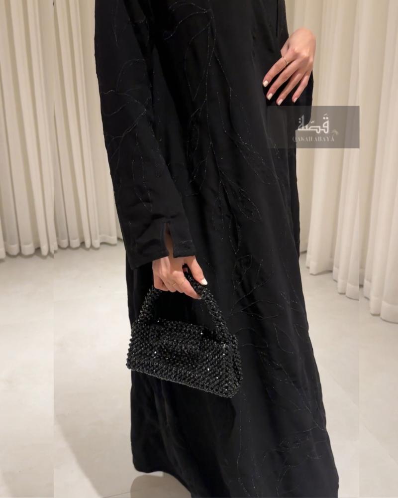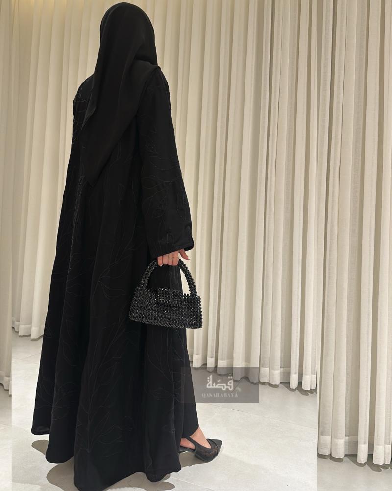 عباية صيفية بدلعة دائرية وتطريز عشوائي (اسود) خاص على كامل العباية مع فتحة بالكم قصة A (كلوش)