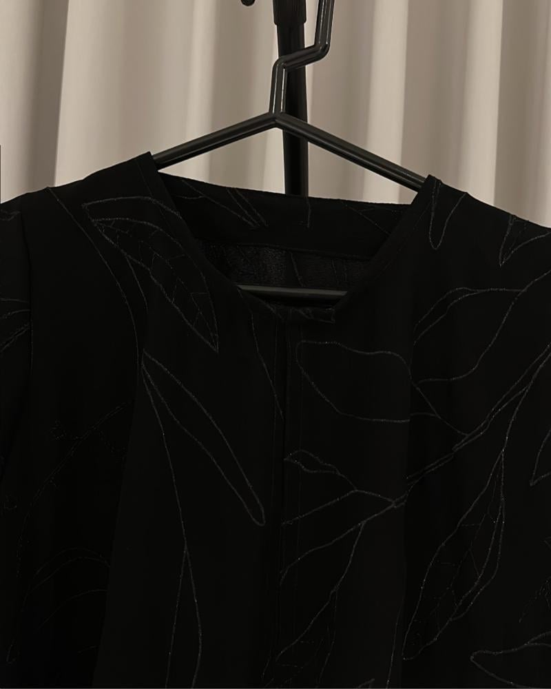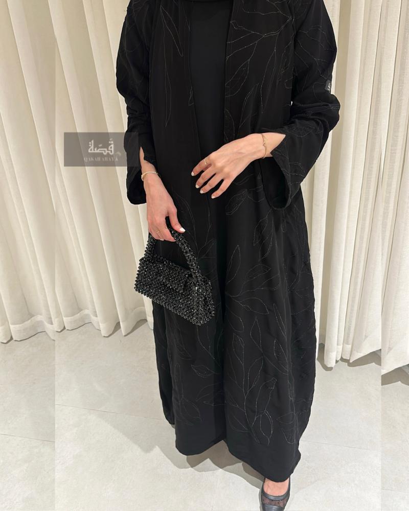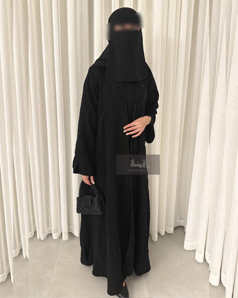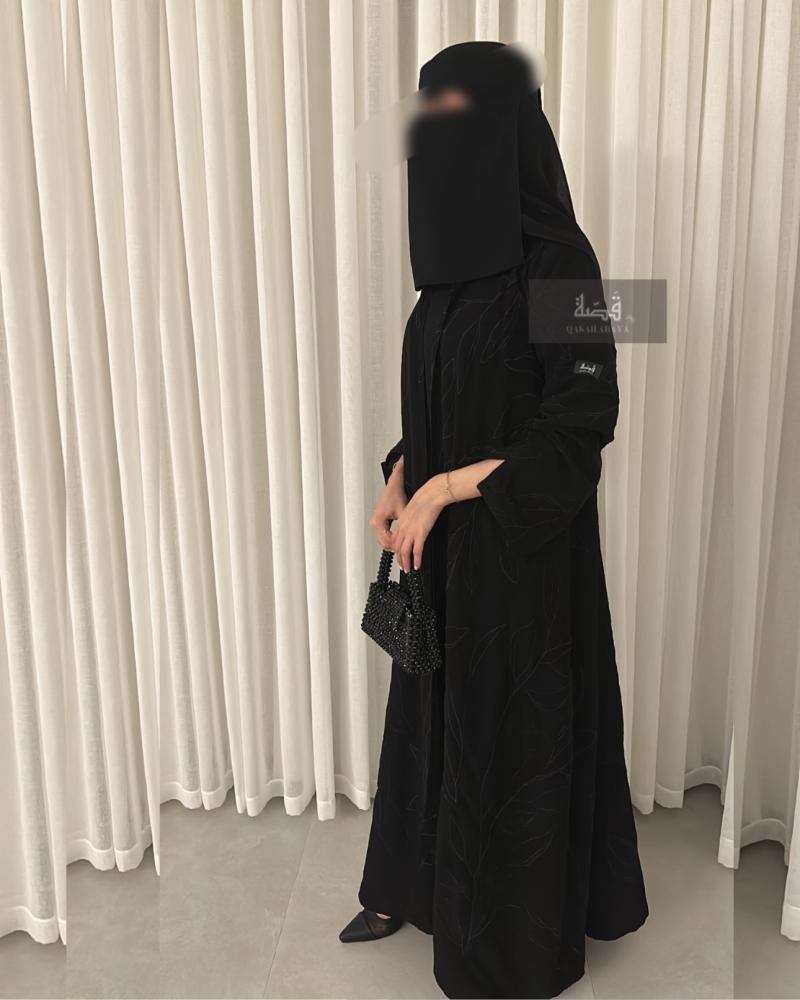 عباية صيفية بدلعة دائرية وتطريز عشوائي (اسود) خاص على كامل العباية مع فتحة بالكم قصة A (كلوش)