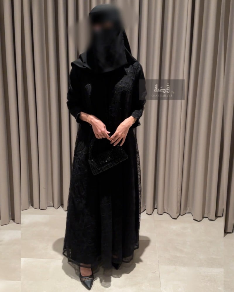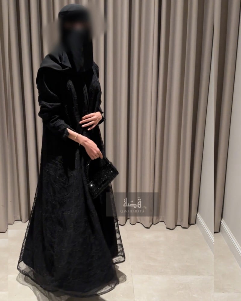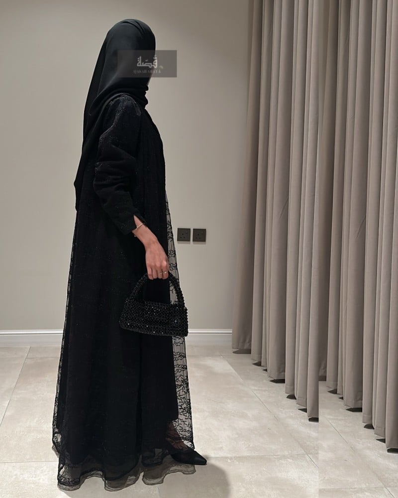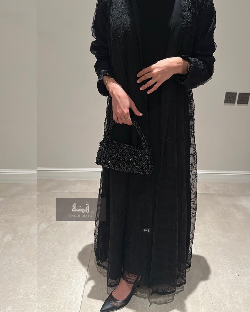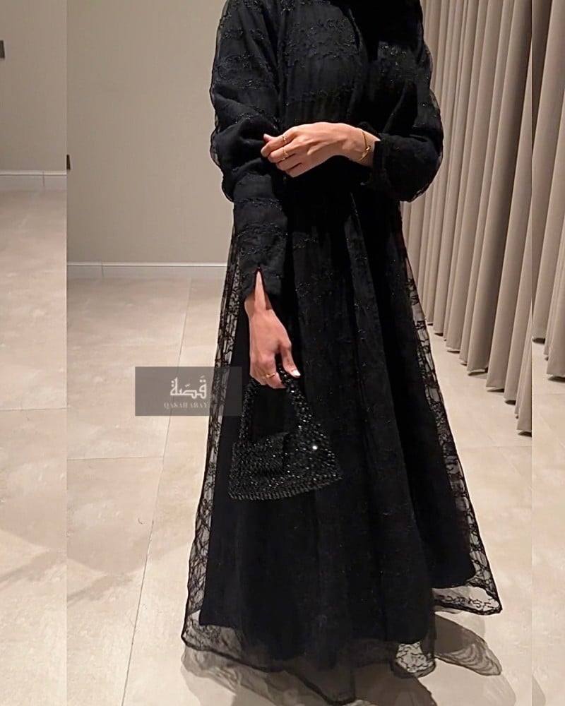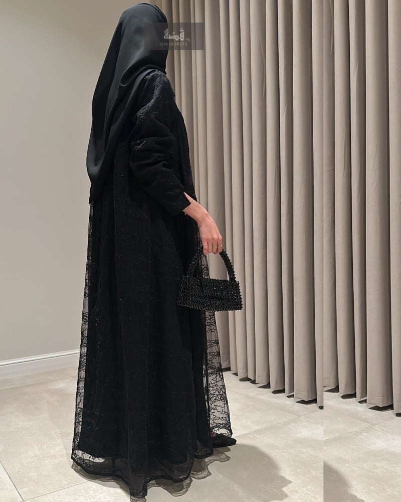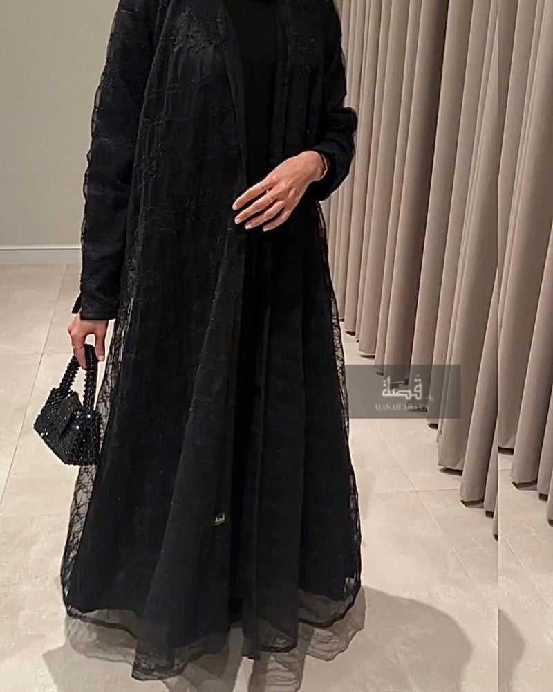 القماش: تل كوري مطرز أسود مبطن (غير شفاف) مع لمعة خفيفة