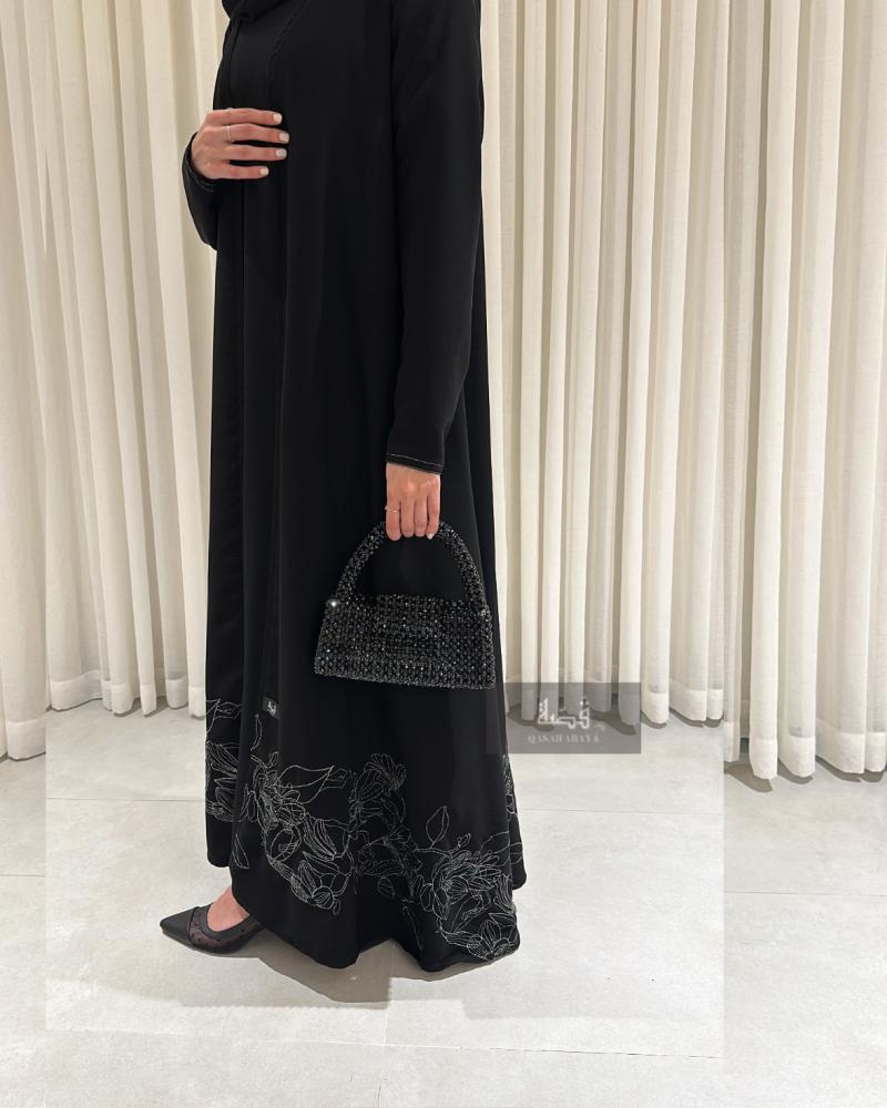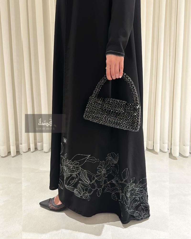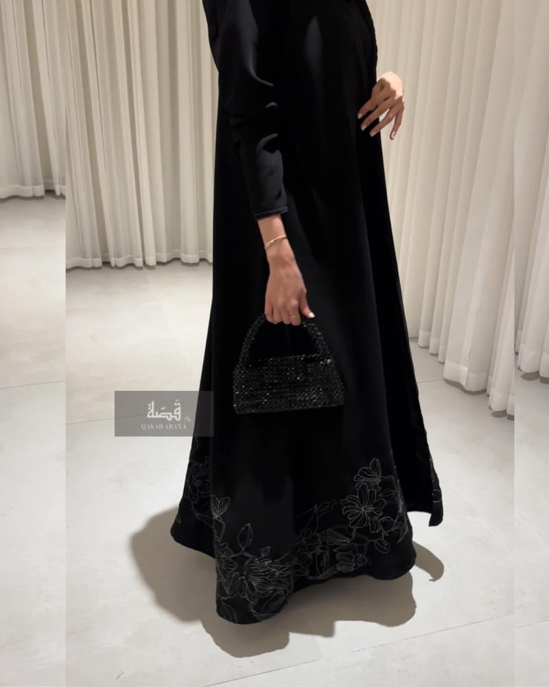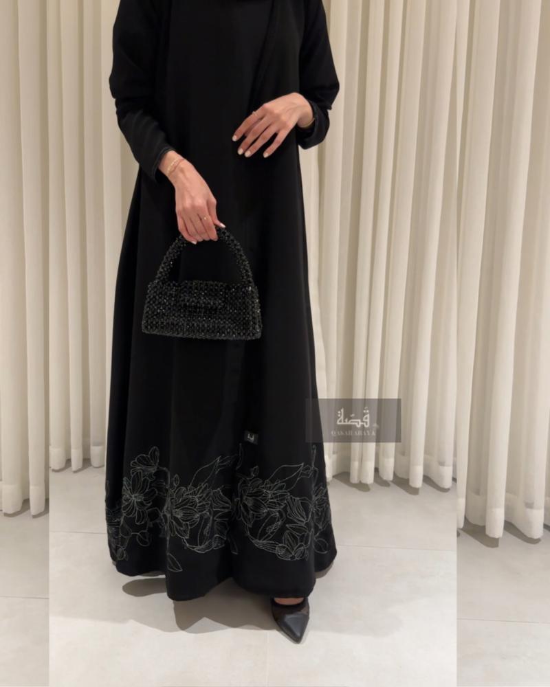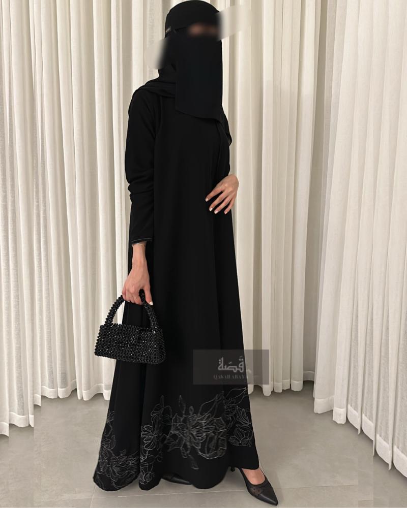 عباية صيفية بتطريز (فضي) خاص اسفل العباية واكمام مزينة بخيوط بيضاء قصة A (كلوش)